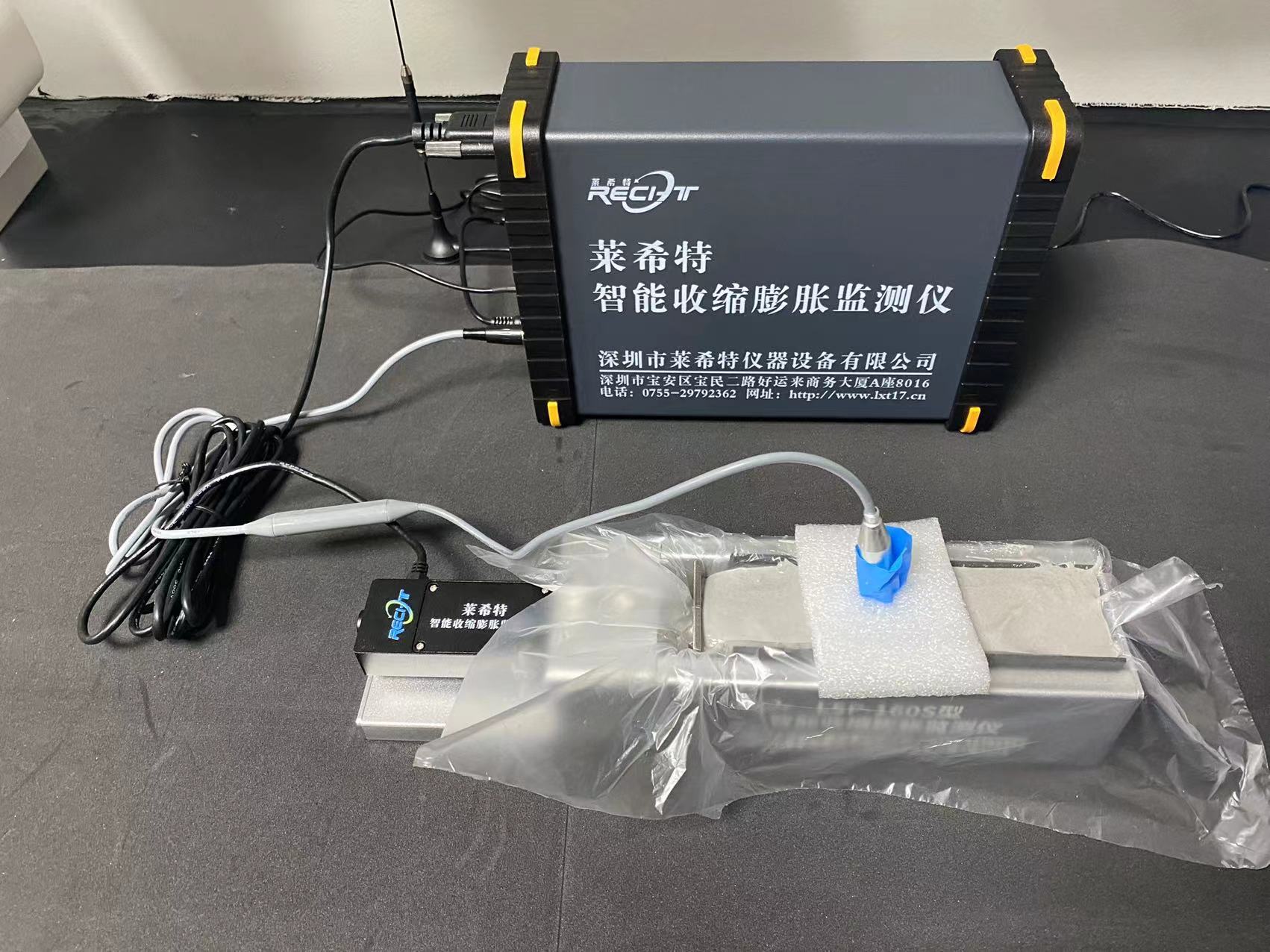 将组装好的LSP-160S型自流平专用收缩膨胀仪放在平整稳定的工作台面上,将拌合好的样品倒入收缩槽中,在槽的一端,材料被弯型固定件固定,这样在材料凝固过程中的形变通过收缩槽另一端的形变位移传感器实时监测数据。连接形变位移传感器探头,并接通数字采集盒电源及信号发射器,待采集盒自检完成,登录物联网云平台开启测试。测试过程中可查看温度、湿度、传感器数据变化、收缩及膨胀率、实时测试曲线、历史记录查询等功能。